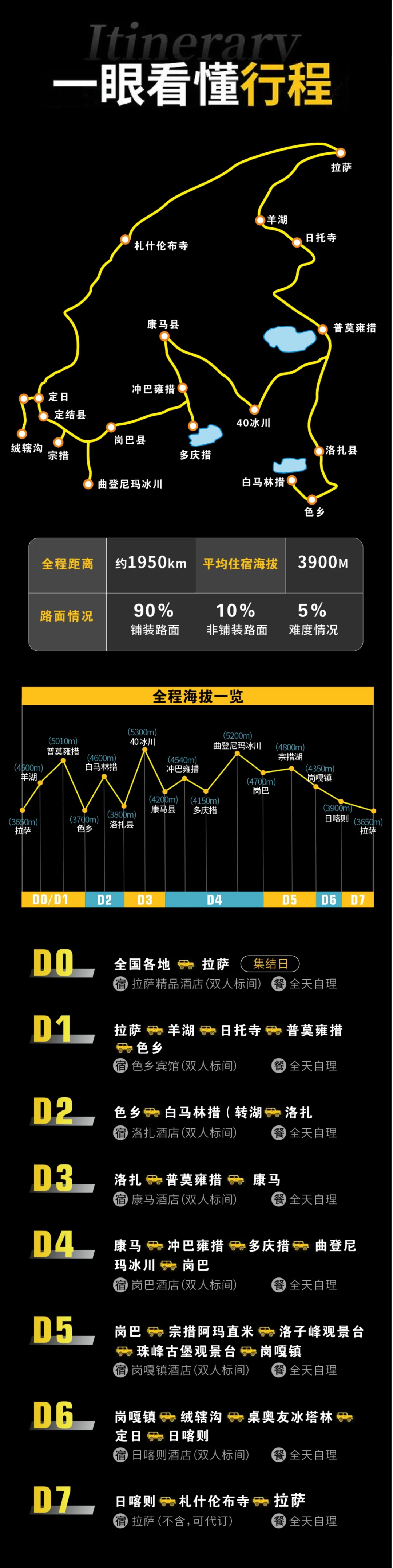 今日全国各地的队友将来到拉萨集合,统一入住我俱乐部安排的酒店。如果您的时间比较宽裕,可以自行安排在拉萨市区的旅游活动,拉萨火车站距市区10公里,可打车到集合酒店。贡嘎机场距拉萨市区65公里,可乘坐机场大巴到拉萨贡嘎机场乘车点民航局门口下车,再打车到集合酒店办理入住。当天尽量少运动,多休息。晚上会统一召开行前见面会,讲解本次活动注意事项。